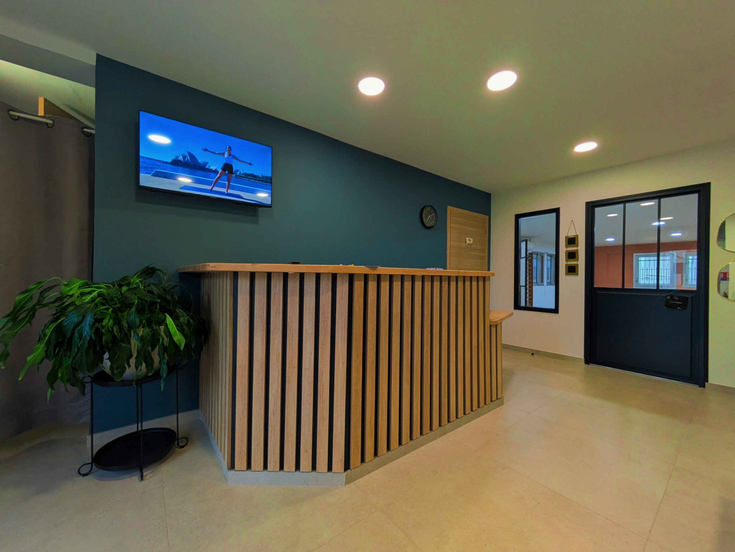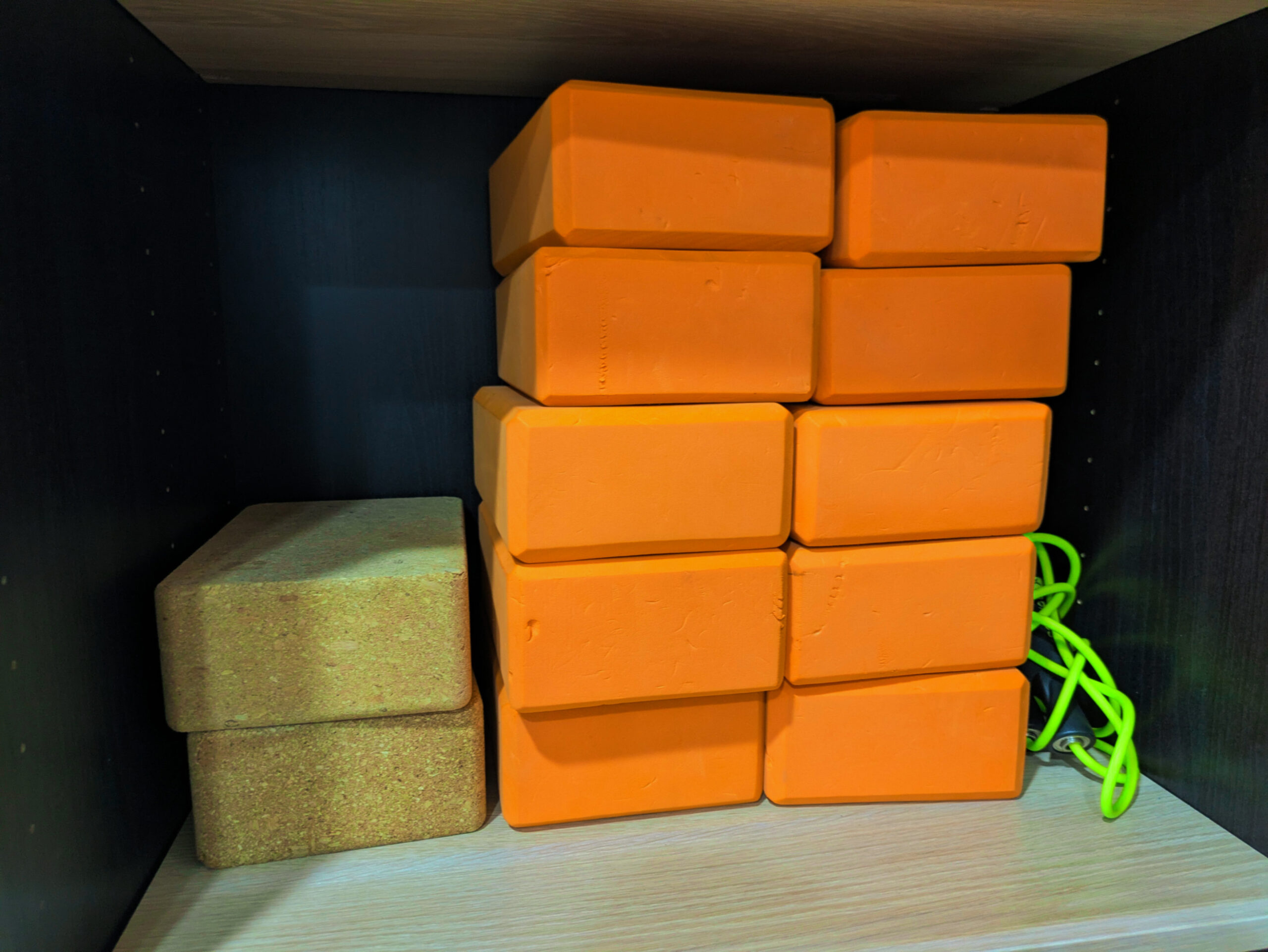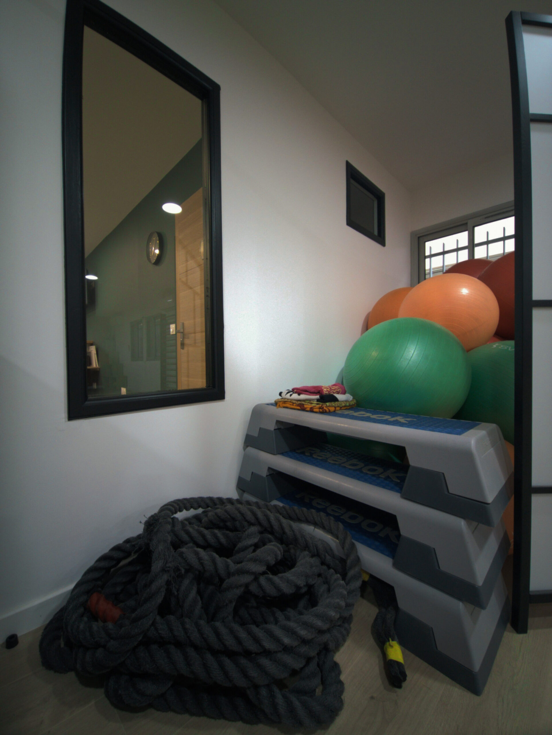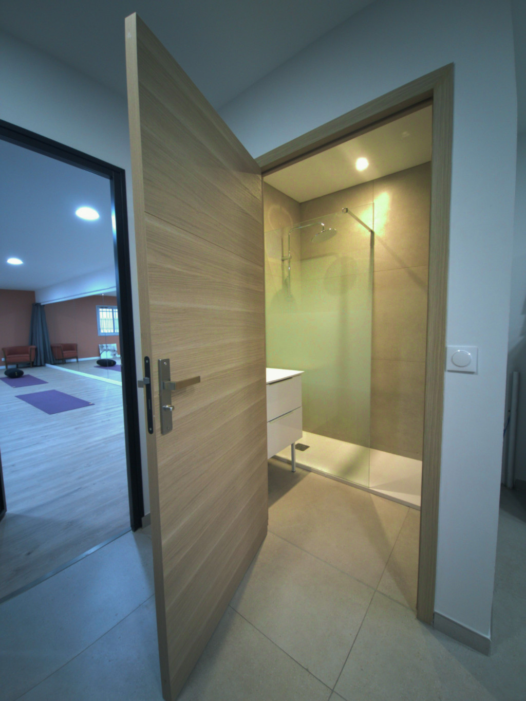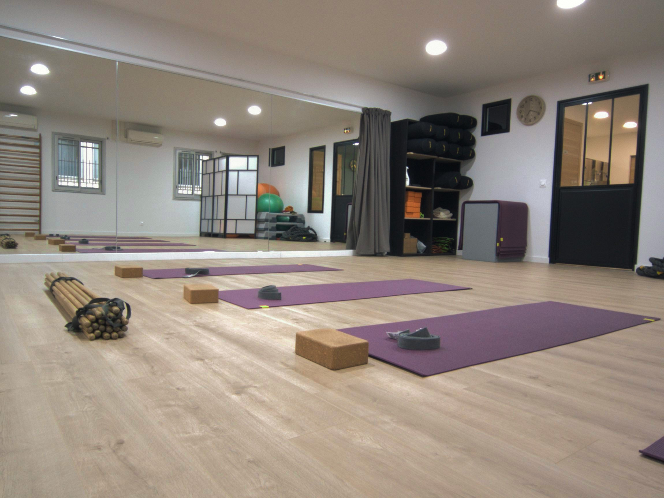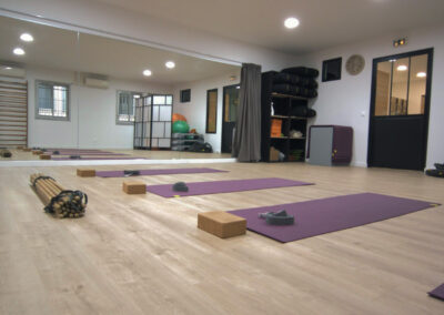 Un espace calme et lumineux, équipé de blocs, sangles et coussins de méditation, idéal pour la pratique du yoga sous toutes ses formes. Le miroir facilite l’ajustement des postures.